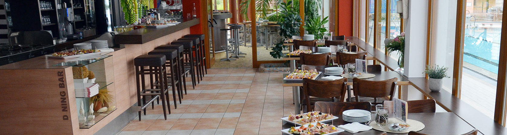 Der Restaurant-Bereich bietet Platz mit freiem Blick auf das Hallenbad für circa 30 Personen, erweitert mit unserem separatem Salon Bereich haben wir die Möglichkeit weitere 25 Gäste dort platzieren zu können.