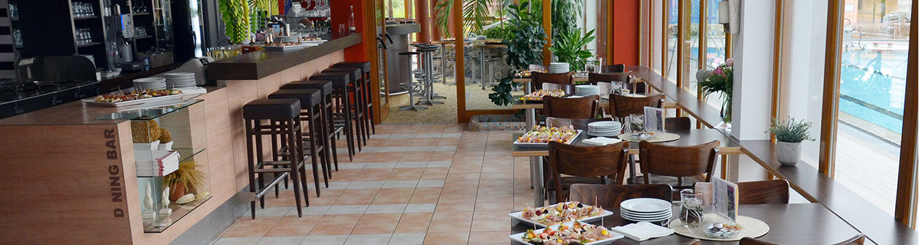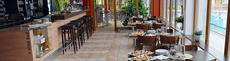 Der Restaurant-Bereich bietet Platz mit freiem Blick auf das Hallenbad für circa 30 Personen, erweitert mit unserem separatem Salon Bereich haben wir die Möglichkeit weitere 25 Gäste dort platzieren zu können.